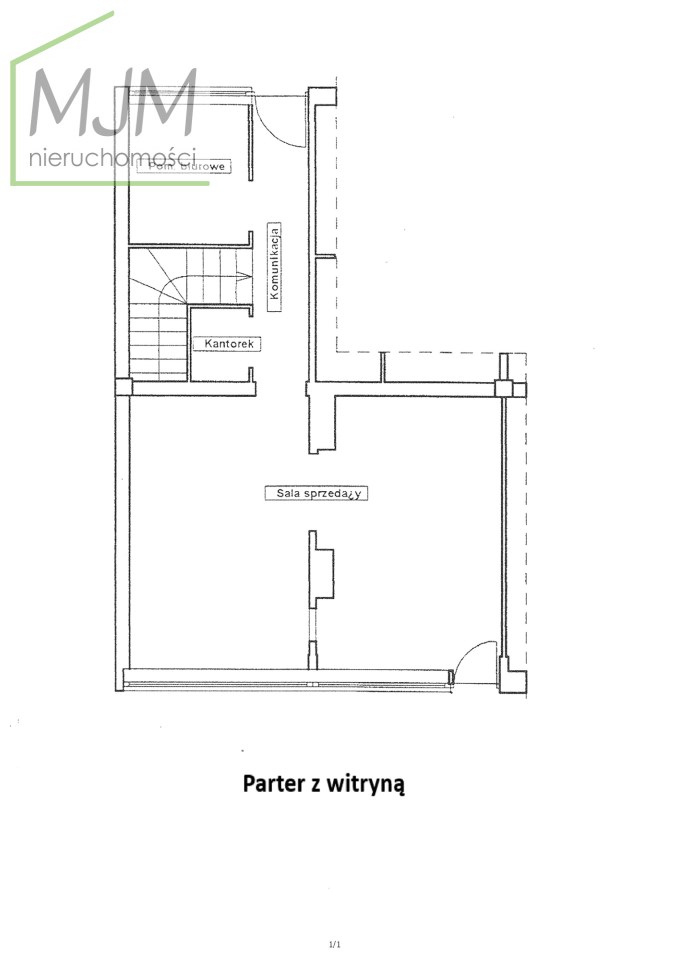 Parter: sala główna z witryną, biuro oraz kantorek. Łączna powierzchnia parteru 48,70 m2.