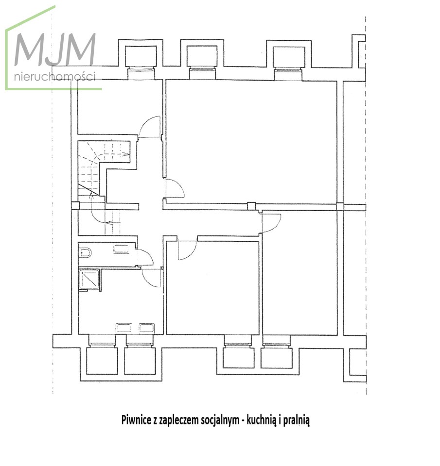 Piwnica: cztery pomieszczenia magazynowe, zaplecze socjalne z kuchnią i pralnią oraz wc. Łączna powierzchnia piwnic 81,30 m2.