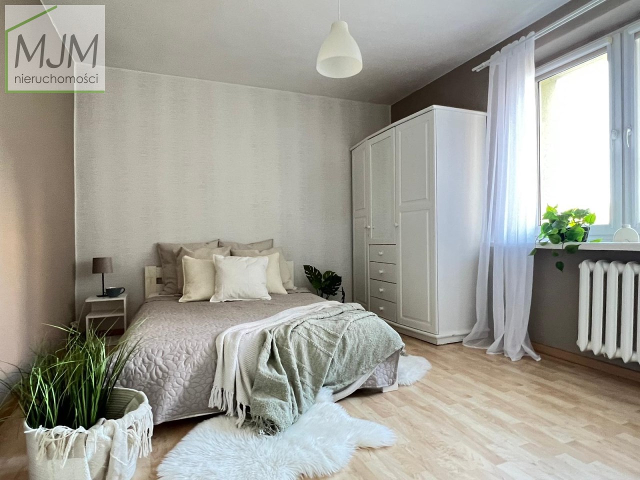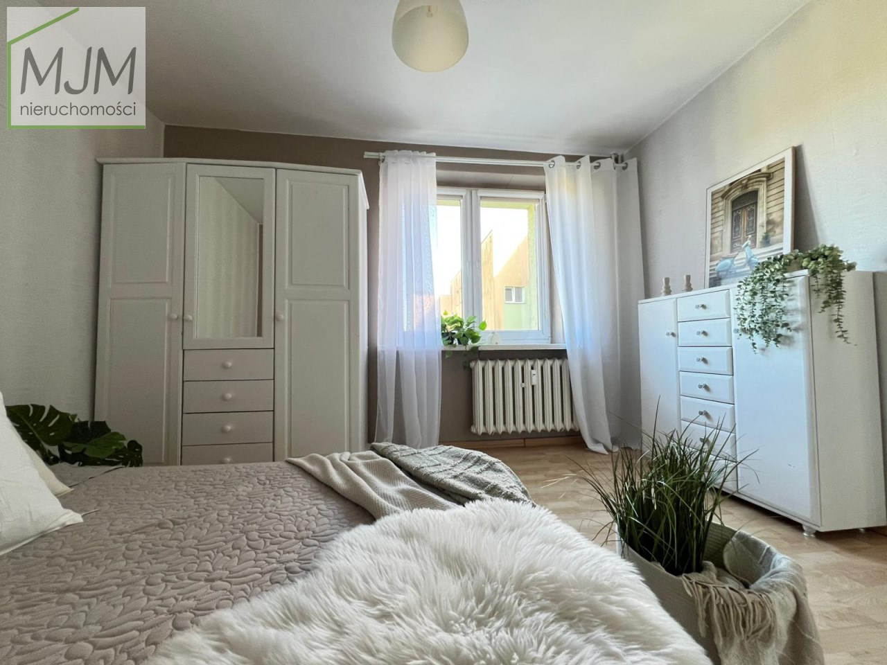 Sypialnia jest przestronna i dobrze doświetlona, tworząc komfortową przestrzeń do odpoczynku.