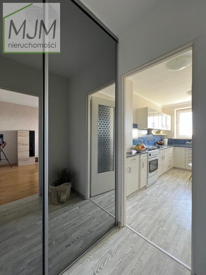 Przedpokój wyposażony jest w obszerną szafę w zabudowie z lustrami, oferując dużo miejsca do przechowywania i optycznie powiększając przestrzeń.