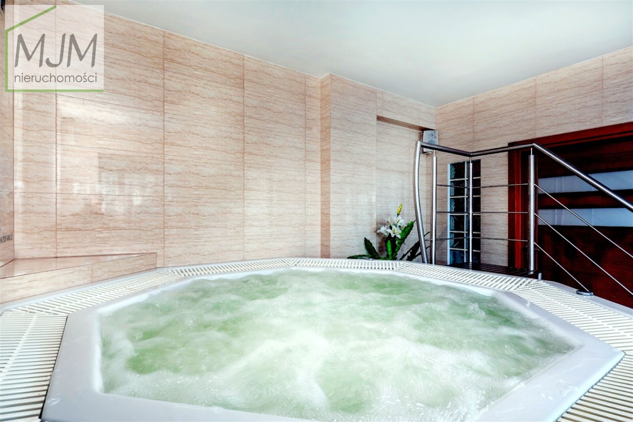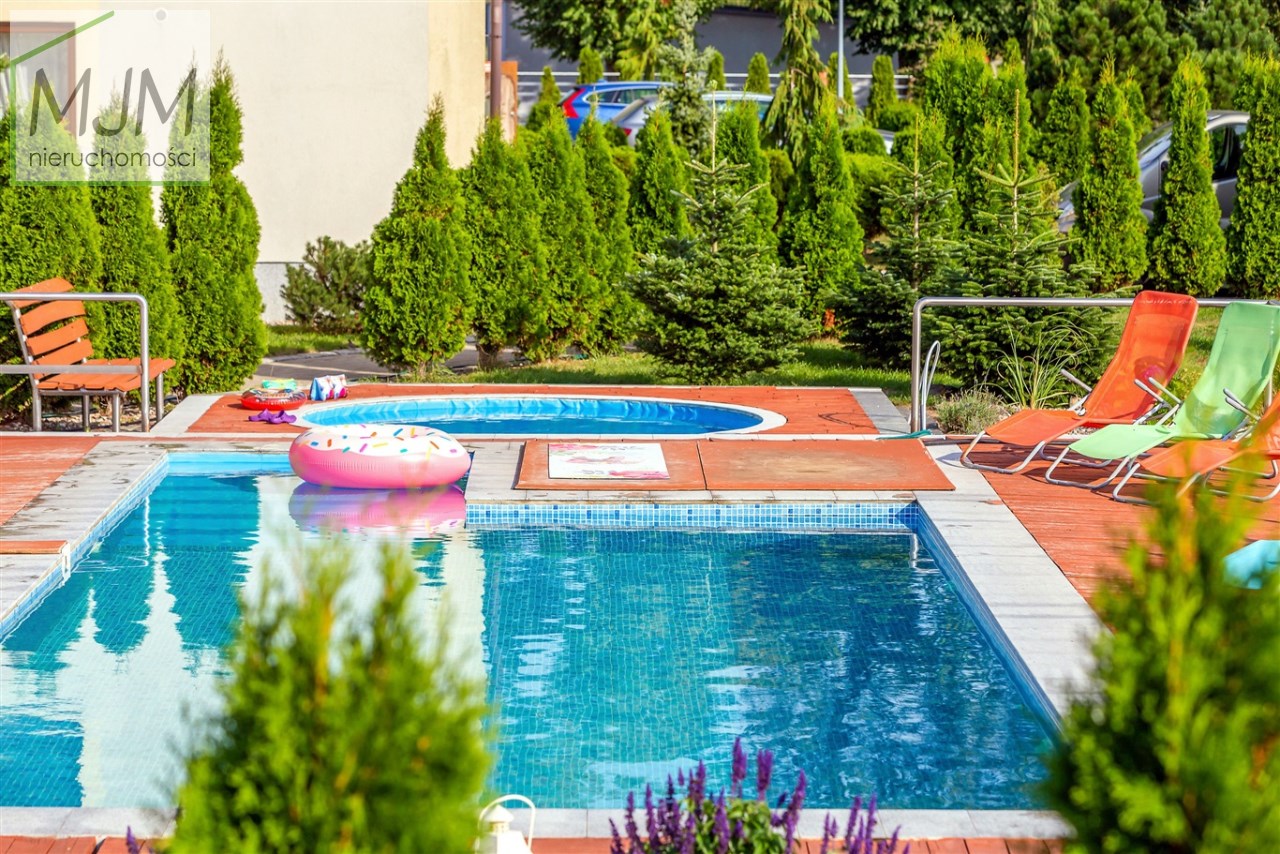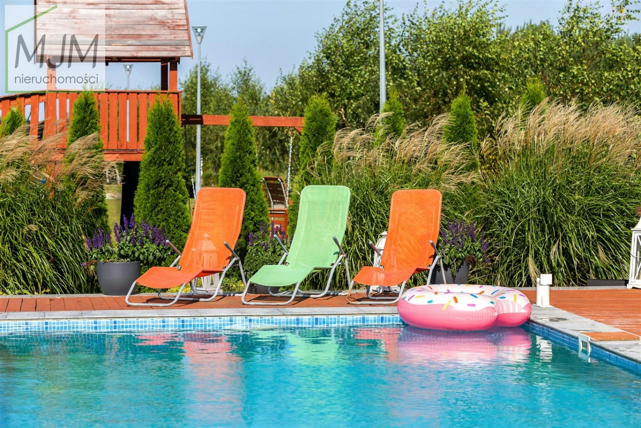 Na terenie posesji znajduje się podgrzewany basen, jacuzzi, miejsce na ognisko i grill, plac zabaw z boiskiem, zjeżdżalnią i huśtawkami, a także parking na 28 pojazdów. Całość otoczona jest licznymi nasadzeniami, alejkami i ścieżkami z kostki brukowej.